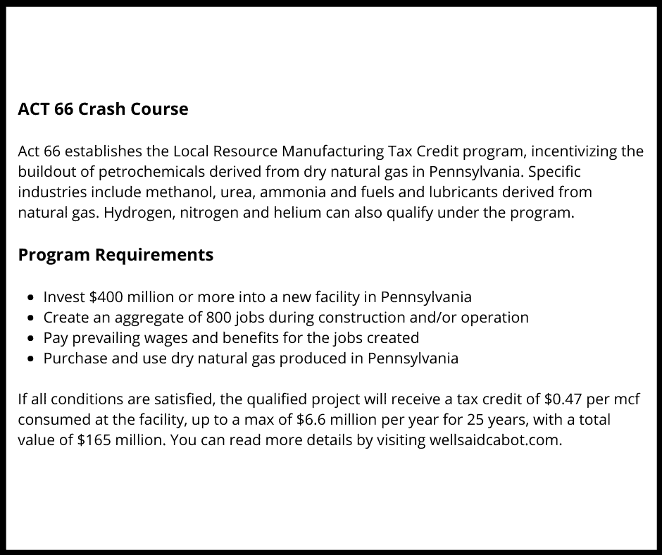 Last July, Act 66, a tax credit program incentivizing the buildout of petrochemicals derived from dry natural gas in Pennsylvania, was signed into law. It’s being called a catalyst for significant job growth in Pennsylvania, as well as investments estimated at a minimum of $400 million.