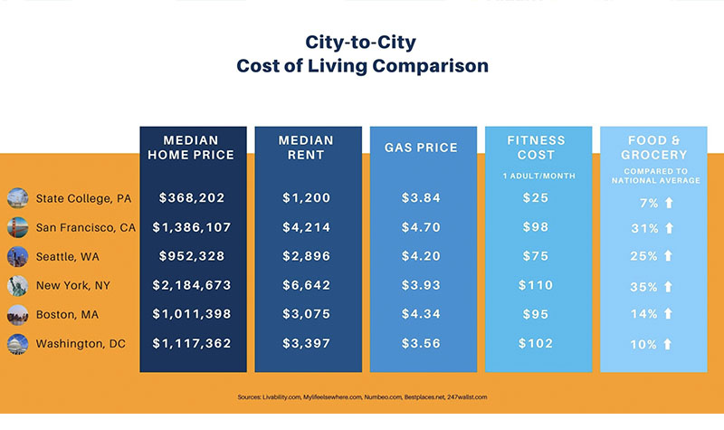 For a previous article about attracting talent, Ben Franklin Technology Partners’ Director of Human Resources and Training Kate Alward suggested that when they’re job hunting, new grads might not weigh cost of living differences between locations, or consider that their dollars could go further in Happy Valley. National inflation is driving up the price of just about everything, and while Happy Valley can’t escape inflation, prices are still well below the national average in most categories. According to Salary.com, the cost of living in State College is 7.6% below the national average, 84.6% lower than New York City, and a whopping 94% lower than San Francisco. Home prices are 43.6% below the national median in the U.S.