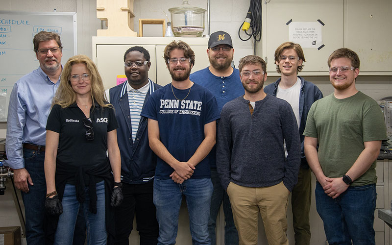 The SSPL works together to push the boundaries of lunar innovation. From left to right: Sven Bilén, director of the Student Space Programs Lab; Aleksandra Radlińska, associate professor of civil engineering; and undergraduate students Craig Oluoch, Samuel Highfield, Alex Baumgartle, Colton Washburn, James Connelley and Patrick Moore.